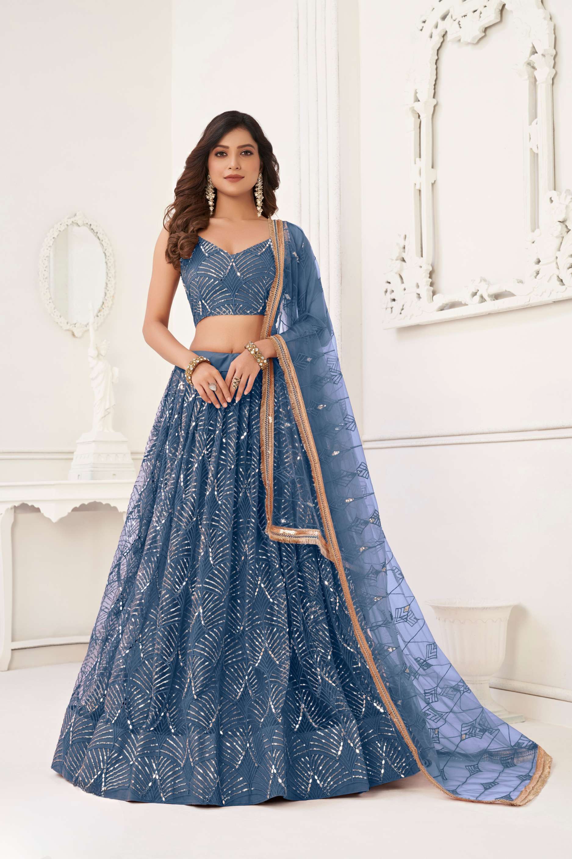Blue Sequins Embellished Net Lehenga Choli & Dupatta will make you look more beautiful on this festive season with indian ethnic essence. This set is enhanced with white resham thread and Sequin embroidery on soft net choli paired with all over equally embellished flared soft net lehenga with satin lining and cancan detail. The beauty part is it’s lace border and thread embroidered soft net dupatta. Style this set with heels and golden jewellery to look stunning with all bridal drama.