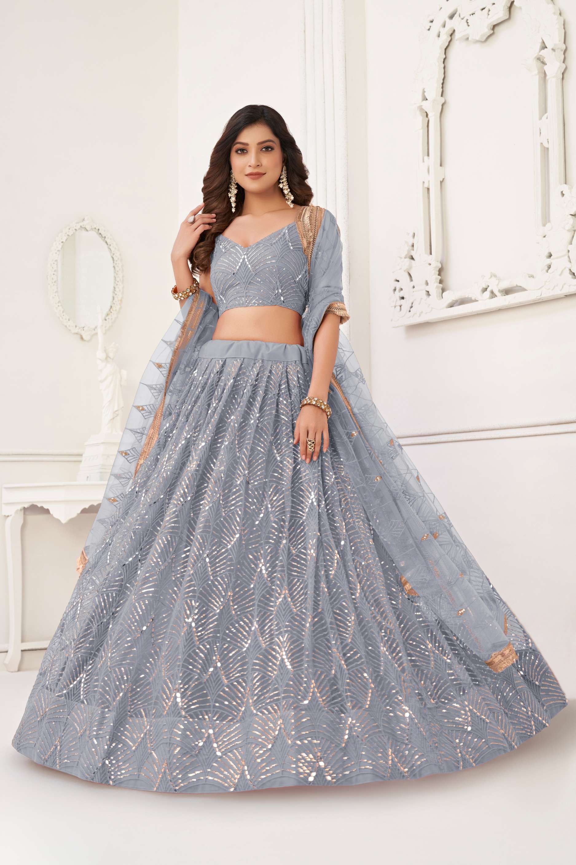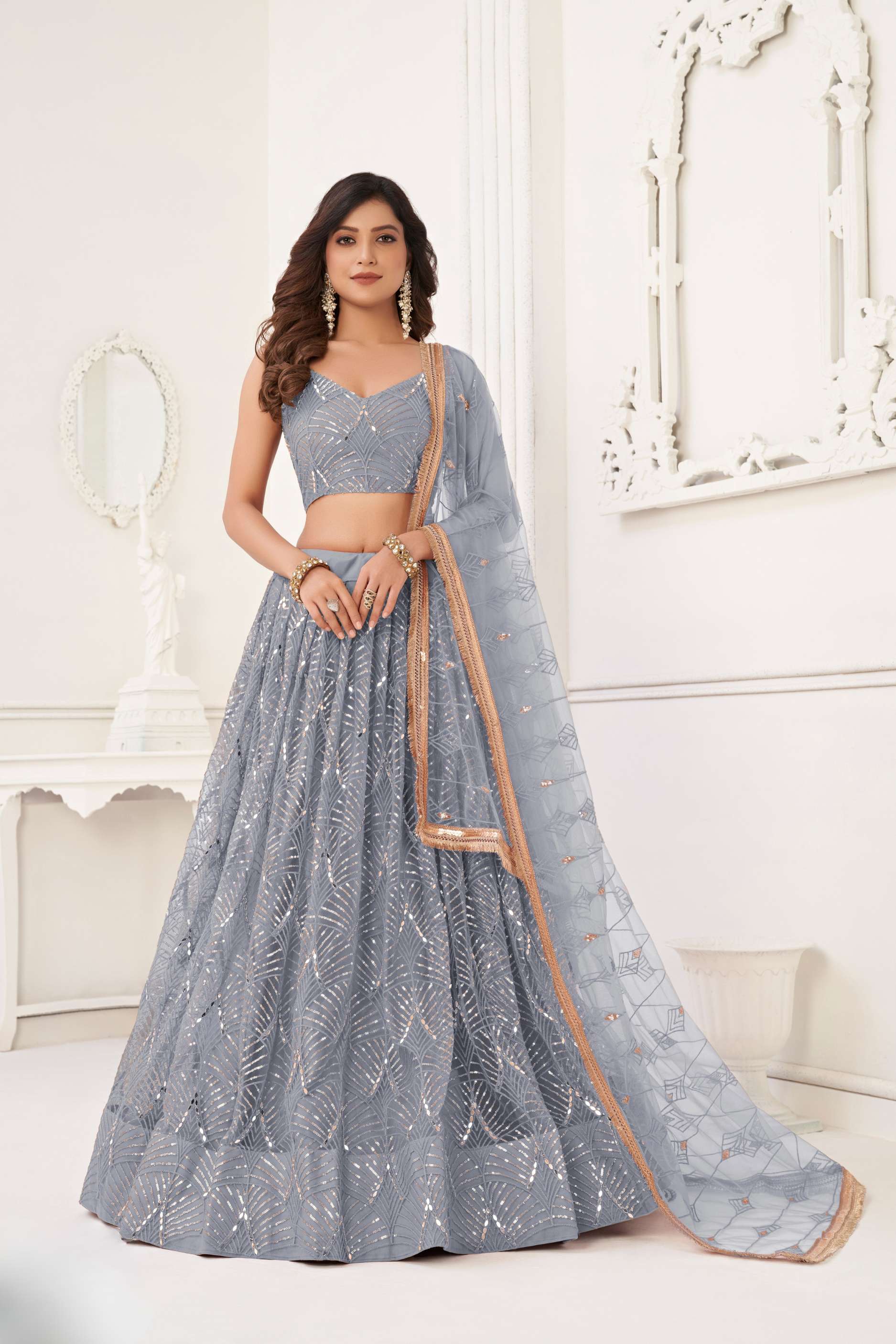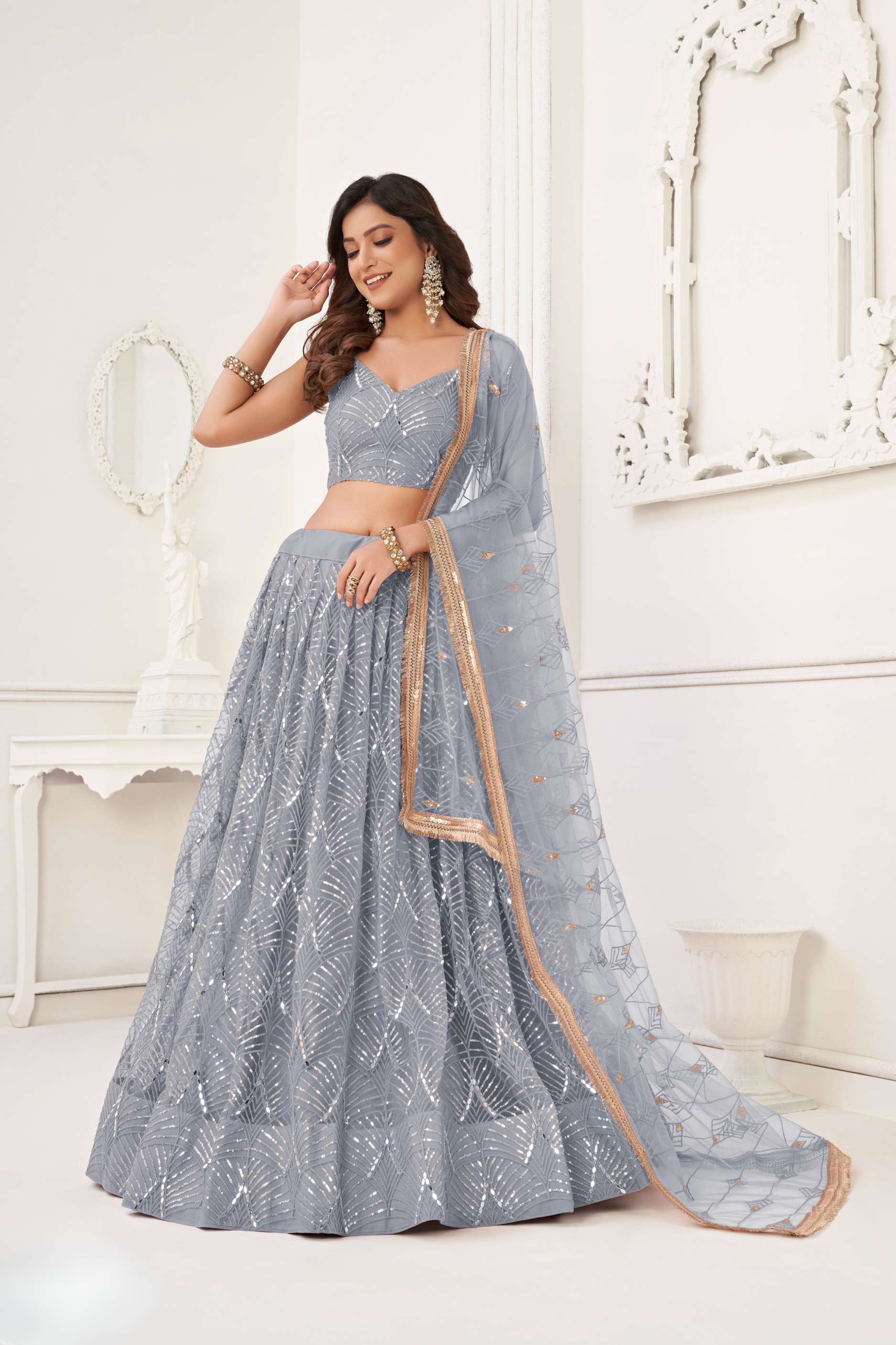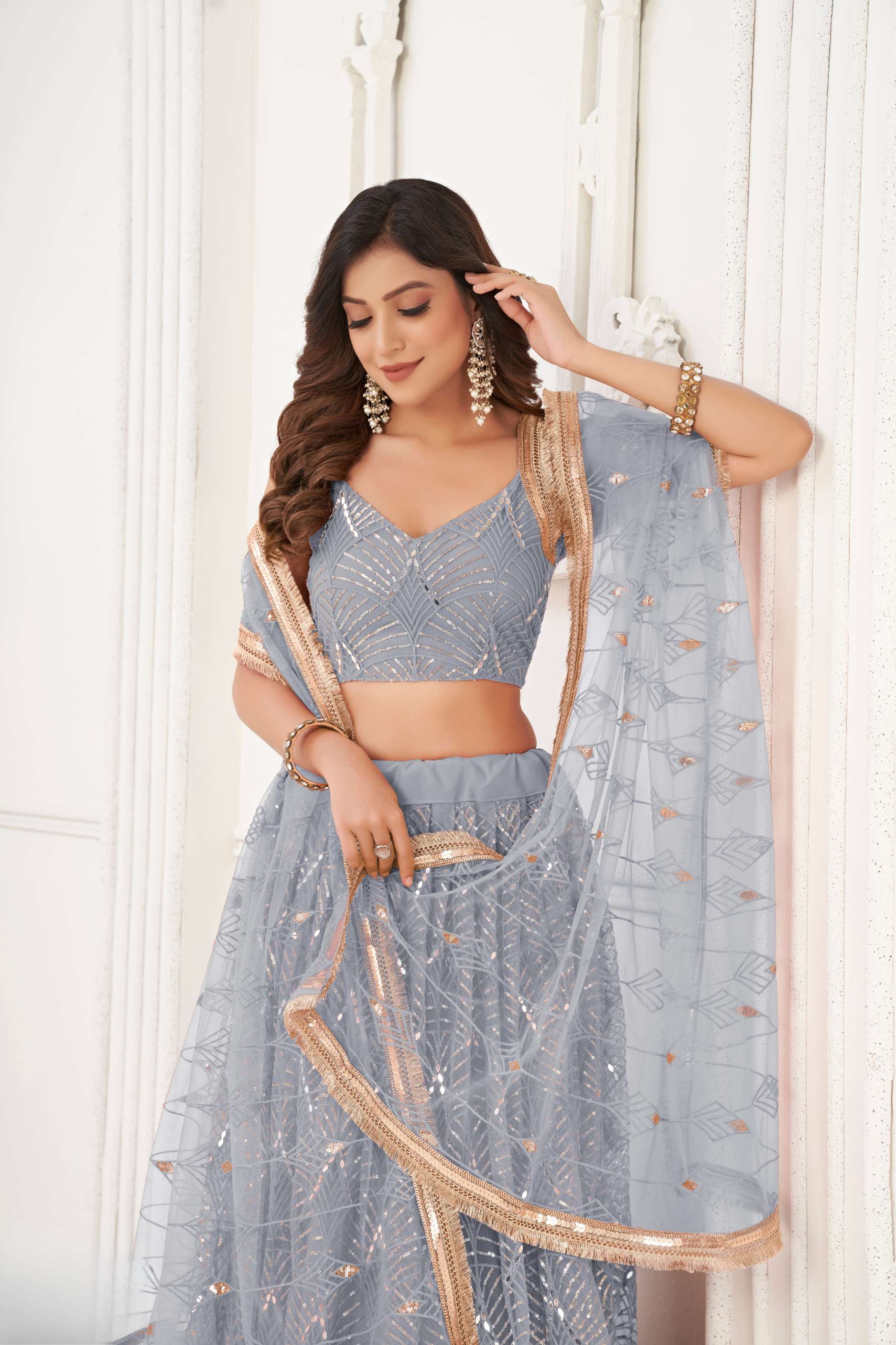 Walk in style adorning this grey colored net lehenga crafted with thread, sequins embroidery. Pared with a matching colored net choli and a net dupatta, both in similar work. The semi stitched choli can be customzied upto 40 inches.