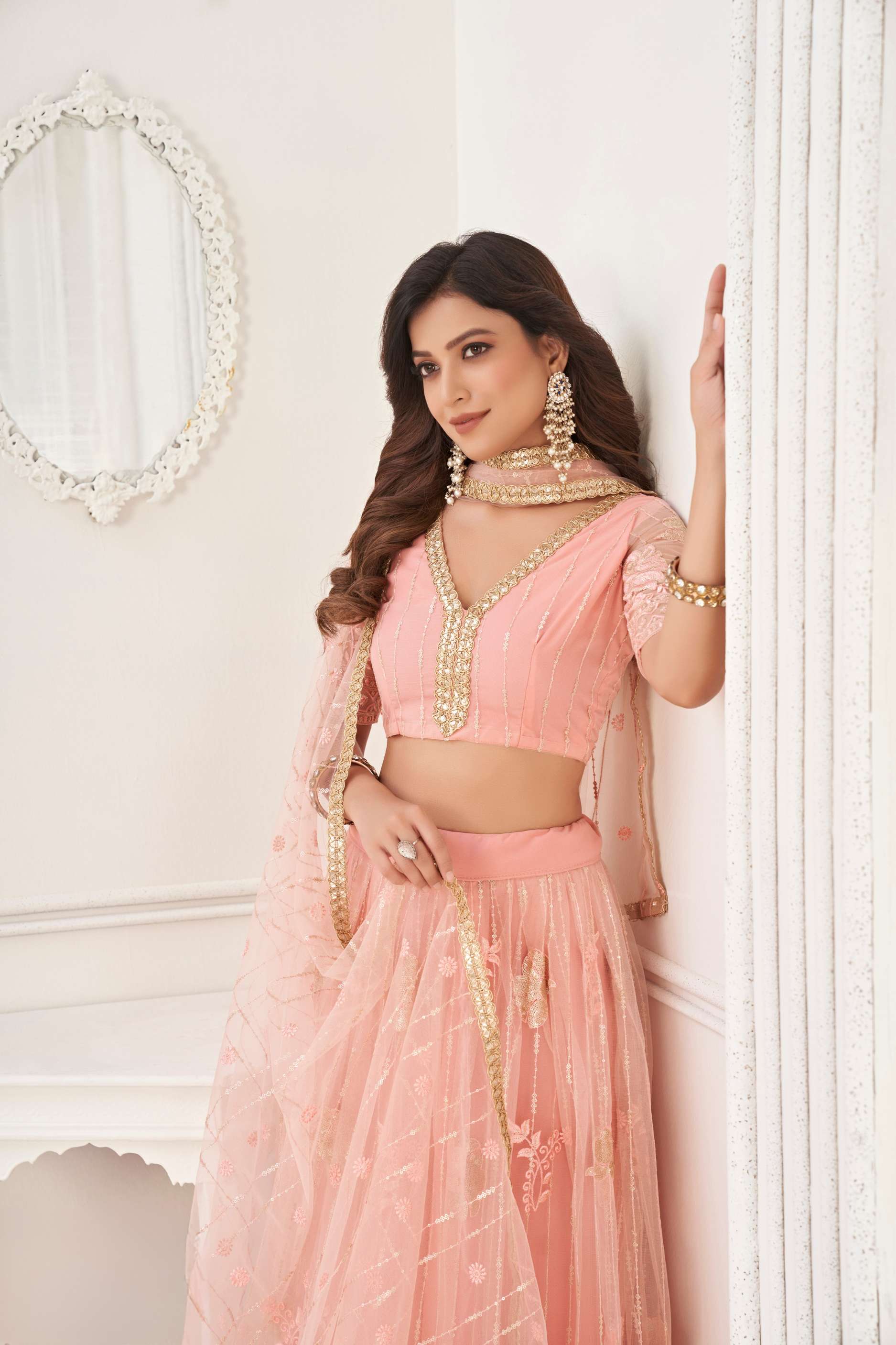 Peach Sequin Embroidery Wedding Lehenga Choli will make you look more beautiful on this wedding season with indian ethnic essence. This set is enhanced with resham thread and sequence embroidery on soft net choli paired with all over equally embellished flared soft net lehenga with satin lining and cancan detail. The beauty part is it’s lace border and thread embroidered soft net dupatta. Style this set with heels and golden jewellery to look stunning with all bridal drama.