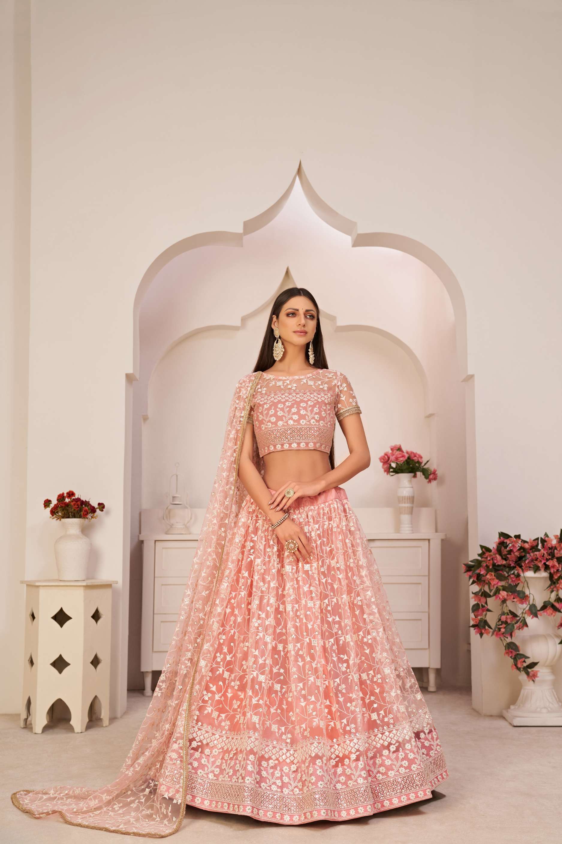 Pink Flared Embroidered Lehenga Choli enhances your festive elegance with its exquisite Indian ethnic charm. This stunning set features delicate white resham thread, minimal zari and sequins embroidery on a soft net choli, paired with an equally embellished flared soft net lehenga with satin lining for a voluminous look. The highlight of this ensemble is its beautifully designed heavy thread embroidered soft net dupatta, adding a touch of sophistication. The rich craftsmanship and intricate detailing make this outfit a timeless masterpiece for grand occasions. Pair it with statement jewelry and embellished footwear for a flawless bridal appearance