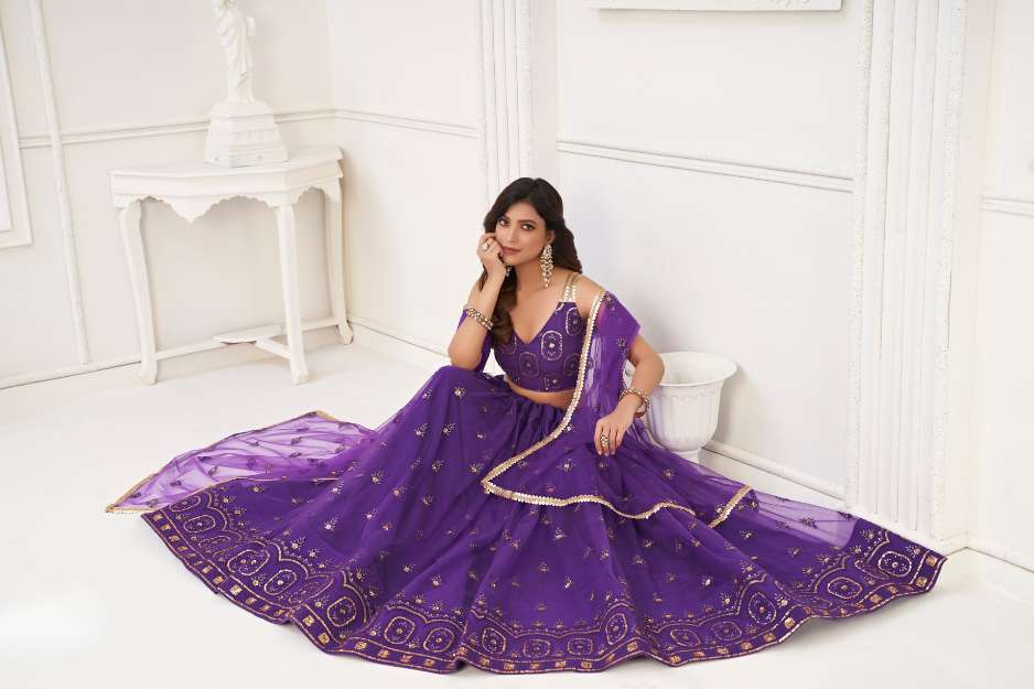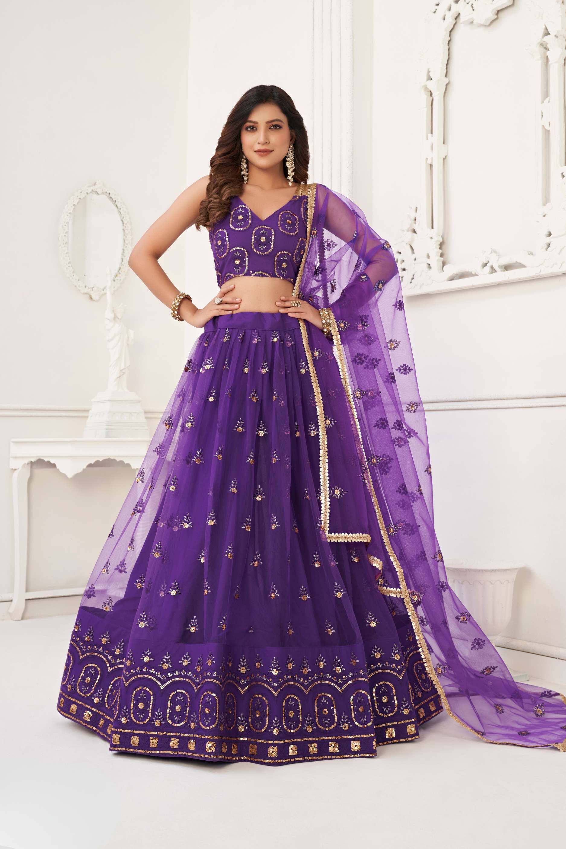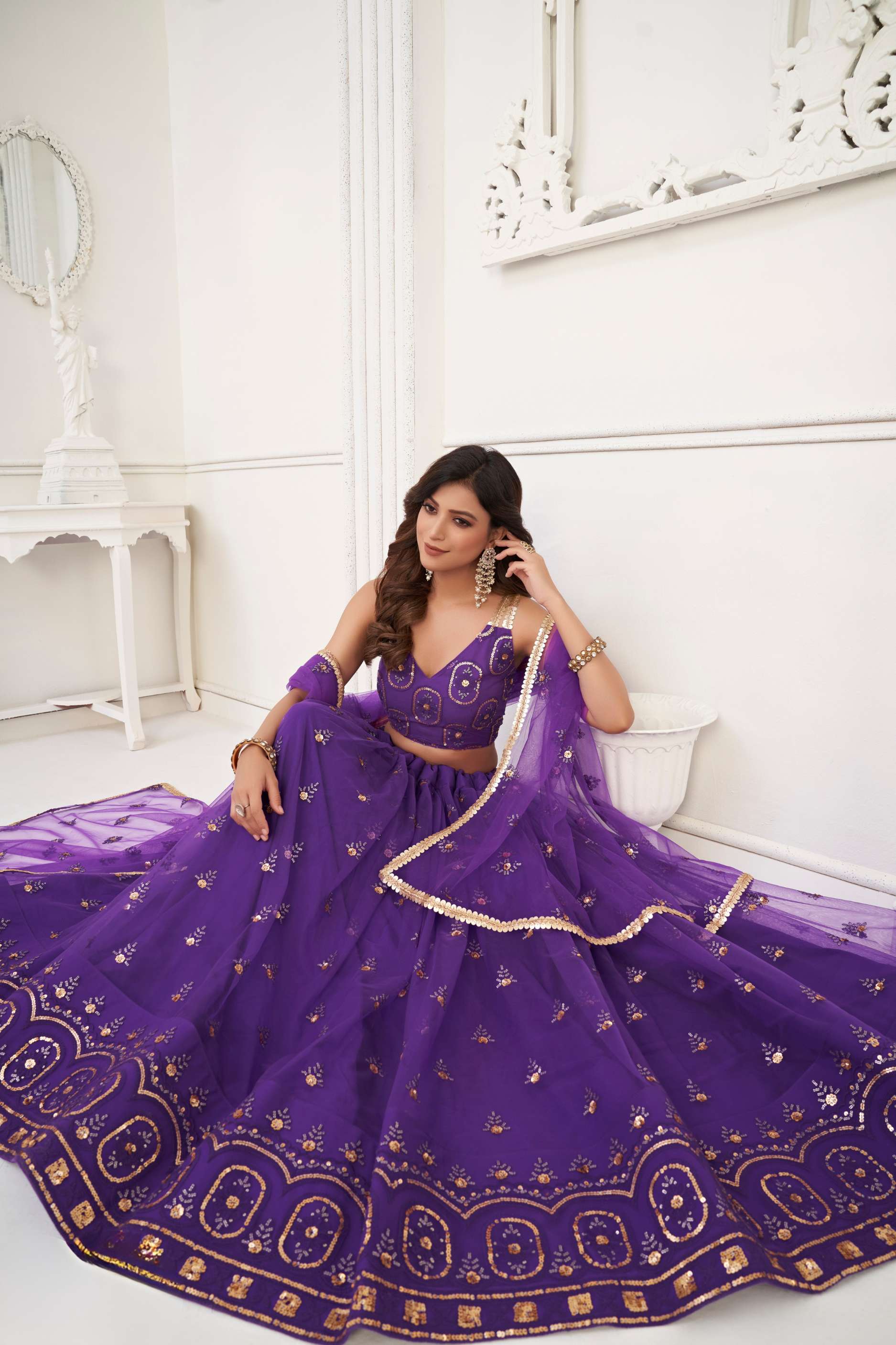 Stand out in the crowd adorning this purple colored net lehenga crafted with thread, sequins embroidery all over. Paired with a matching colored net choli and a net dupatta, both in similar work embroidery.