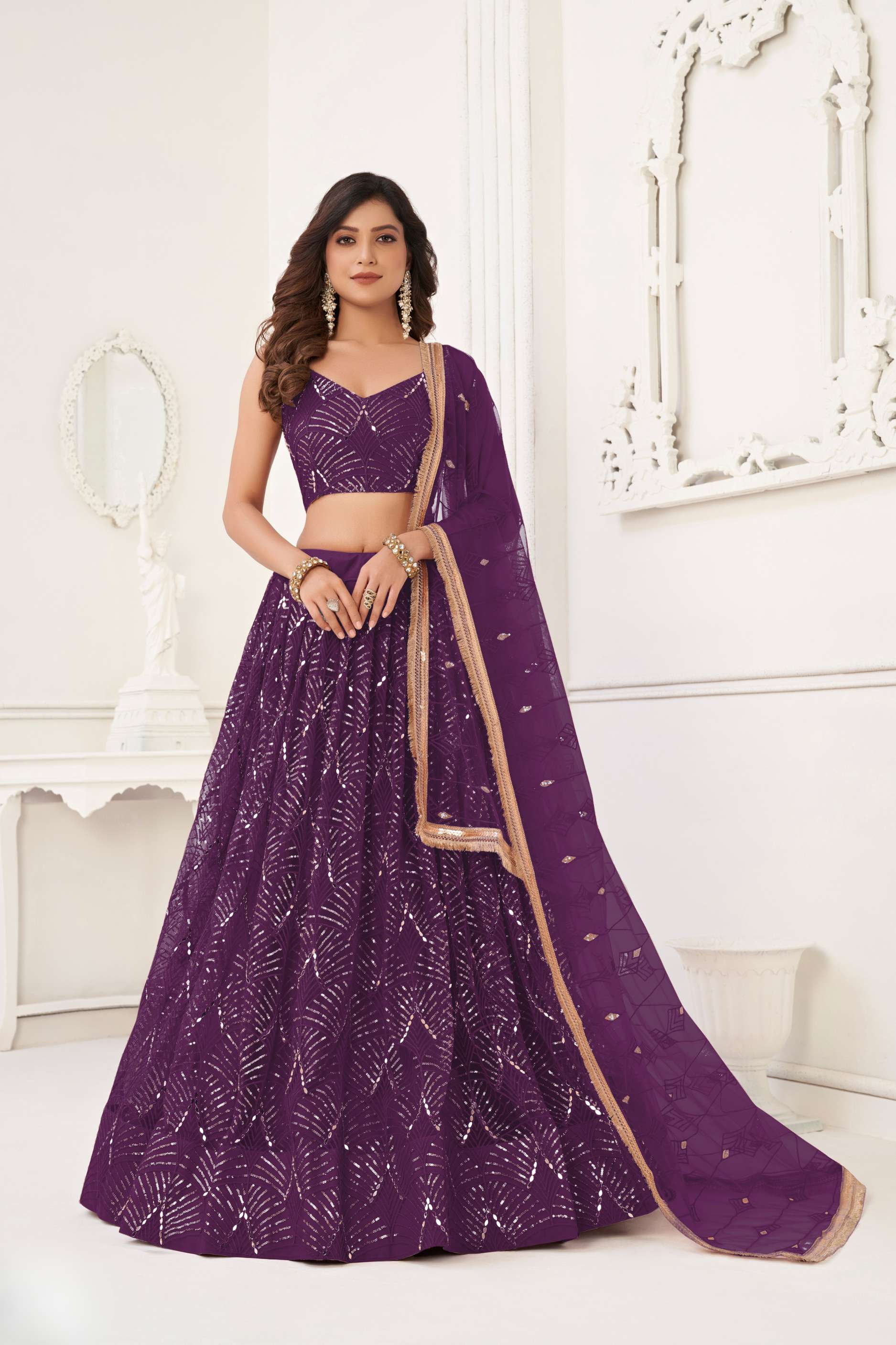 Allure the crowd adorning this purple colored net lehenga crafted with thread, sequins, mirror embroidery all over. Paired with a matching colored net choli and a net dupatta, both in similar work embroidery.