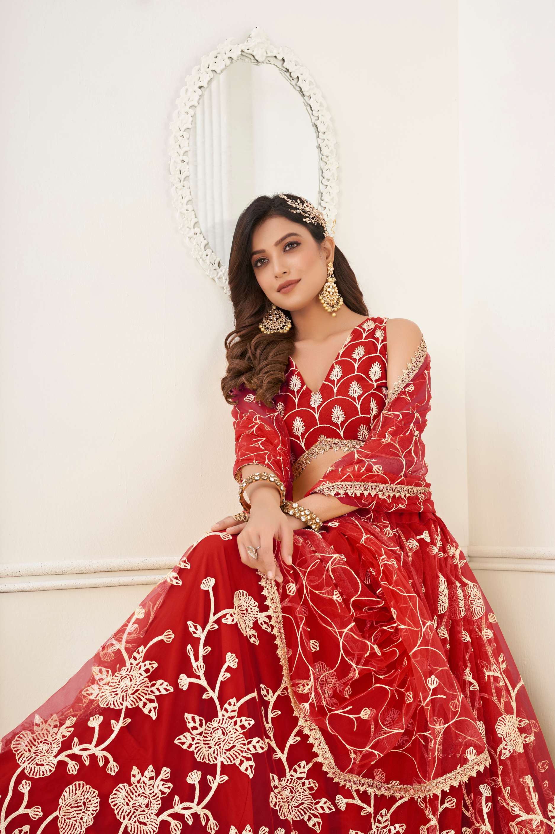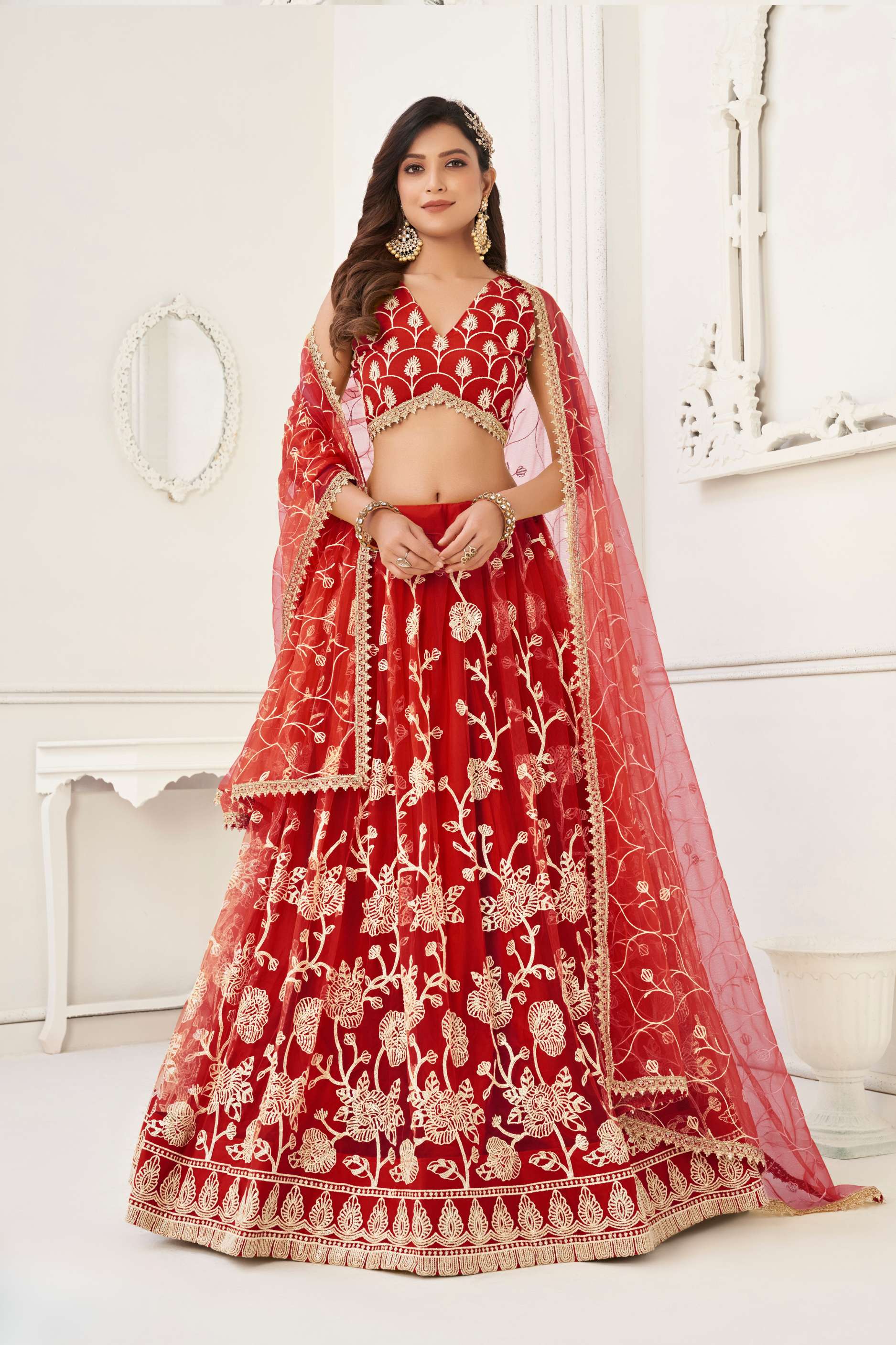 Dazzle the crowd adorning this red colored net lehenga decked with dori and thread embroidery detailing enriched by sequins embellishment all over. Complemented with similarly embroidered net choli and an embellished net dupatta both in matching color. Also provided with a satin lining. The semi stitched choli can be customised upto 42 inches.