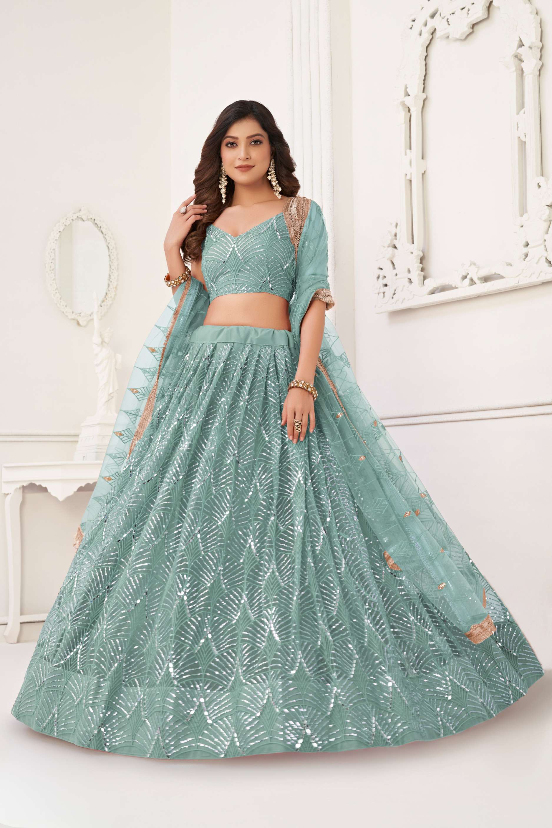 Sea Green Traditional Wedding Lehenga Choli will make you look more beautiful on this festive season with indian ethnic essence. This set is enhanced with white resham thread and Sequin embroidery on soft net choli paired with all over equally embellished flared soft net lehenga with satin lining and cancan detail. The beauty part is it’s lace border and thread embroidered soft net dupatta. Style this set with heels and golden jewellery to look stunning with all bridal drama.