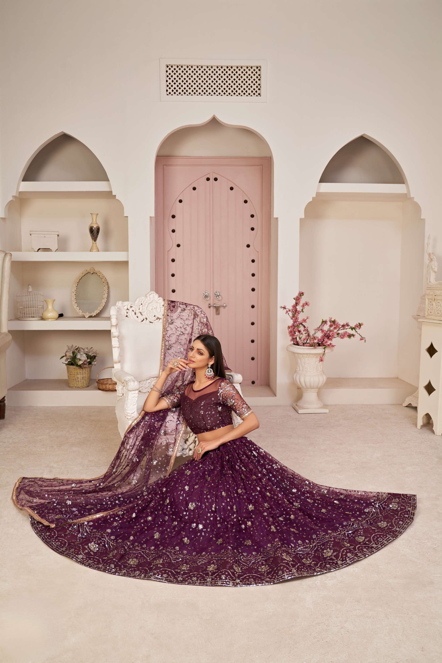 Steal the scene adorning this purple (Wine) color lehenga made in net. Designed all over using sequins and thread embroidery created in floral themes. Also comes along with a matching purple color net choli and a laced net dupatta, both embellished in similar work.