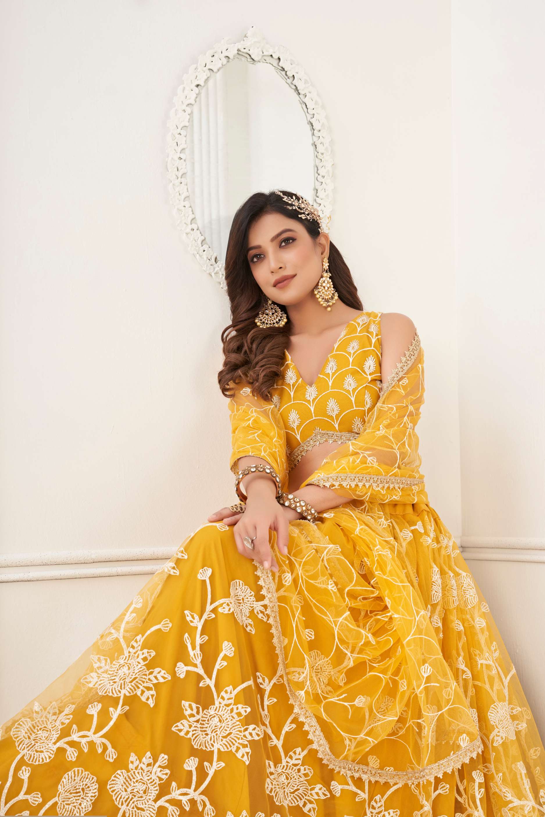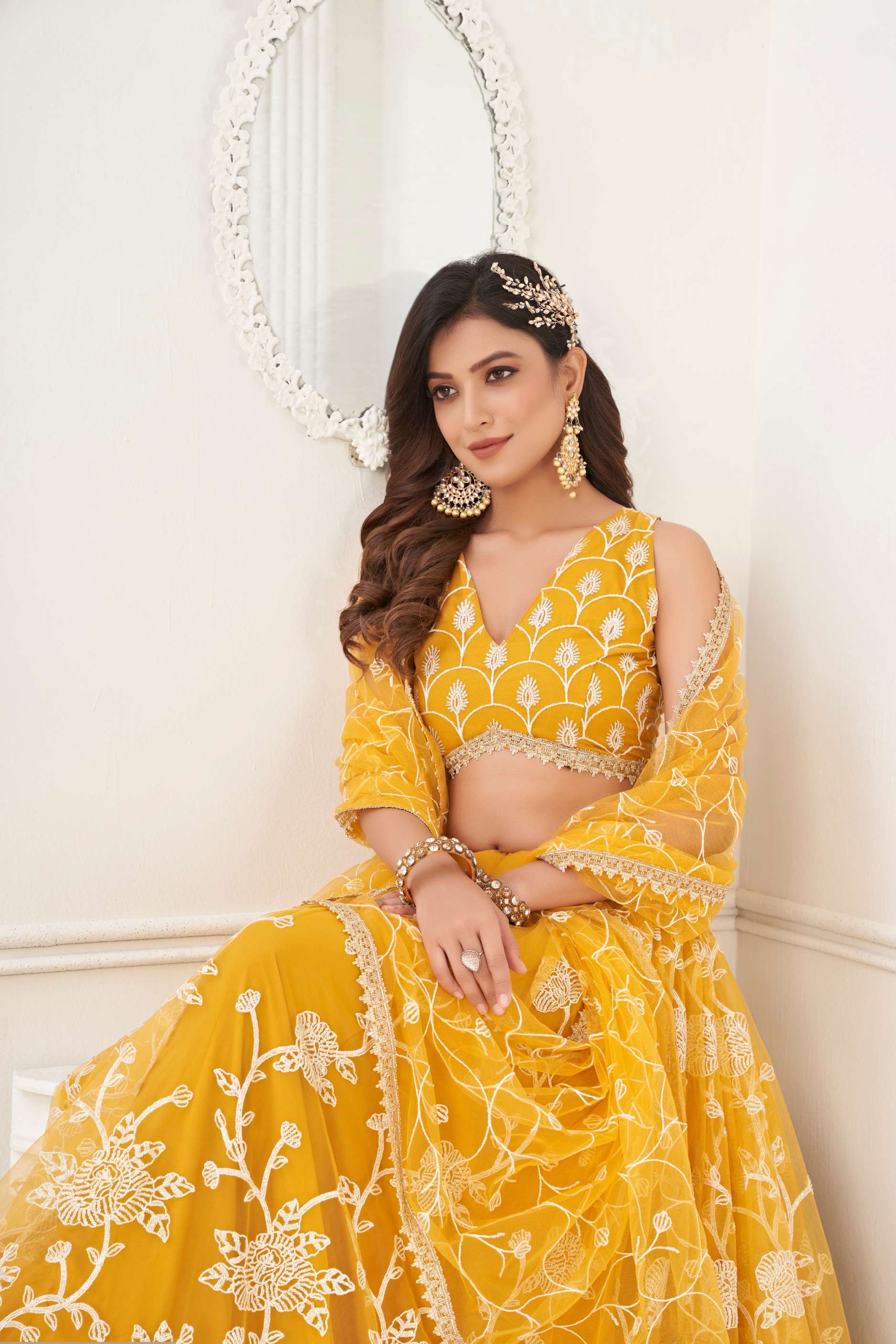 Make a shiny statement adorning this mustard yellow colored lehenga crafted in net with beautiful sequins and dori work embroidery all over. Paired with a matching color similarly embroidered net choli and a mustard yellow color lace bordered net dupatta in similar work. The semi-stitched choli can be customised up to 42 inches.