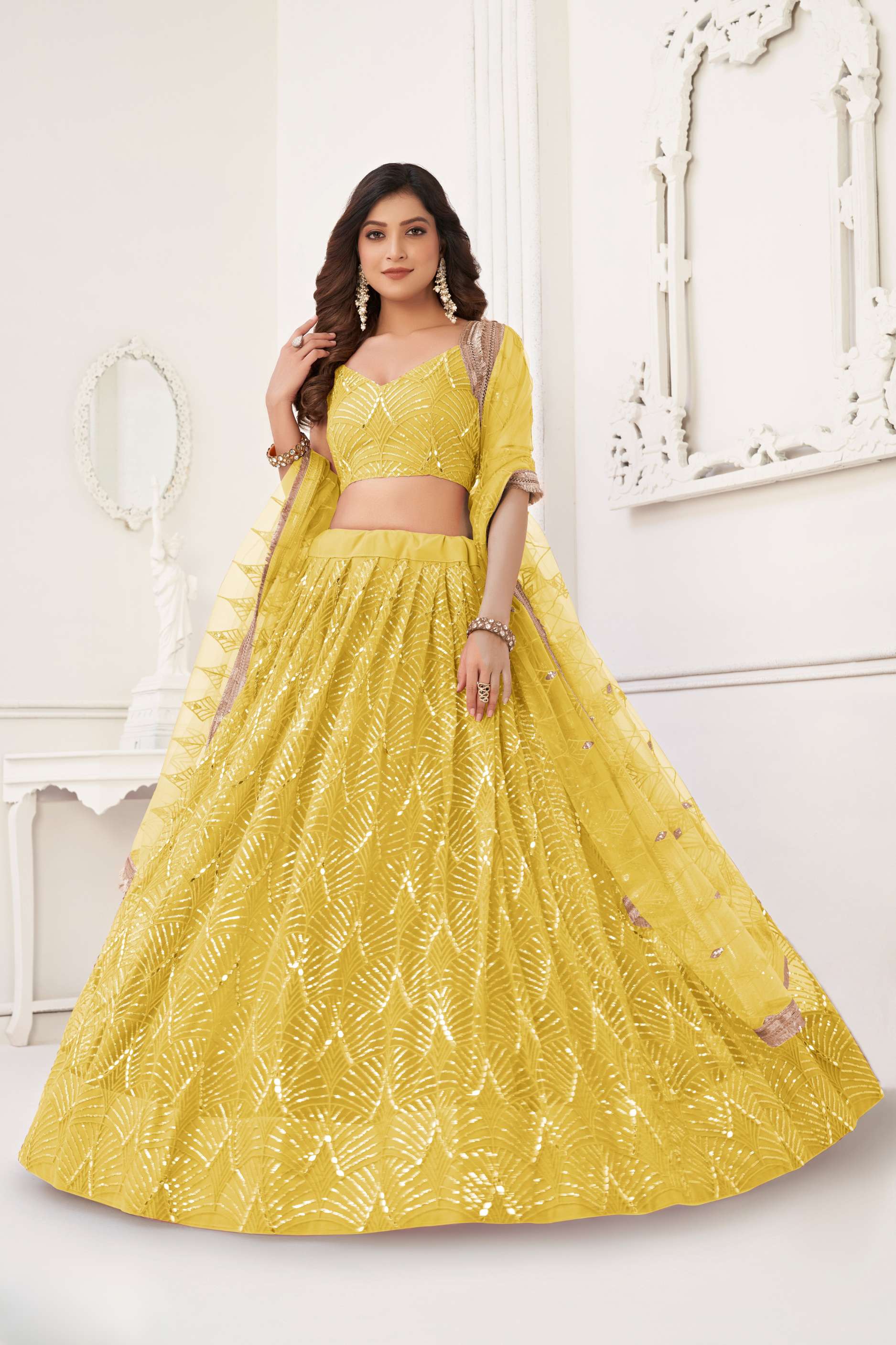 Look like a day dream adorning this yellow colored net lehenga crafted with thread, sequins embroidery. Pared with a matching colored net choli and a net dupatta, both in similar work.